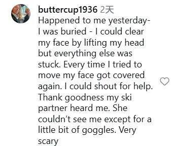 “昨天,我也遇到了这样的事——我被埋了——我抬起头,能把脸露出来,但身体的其他部位都被困住了。每次我试着动一下,脸又会被雪盖住。我大声呼救。谢天谢地,我的滑雪搭子听到了我的声音。她只能看见我的一小块护目镜。太可怕了。”
